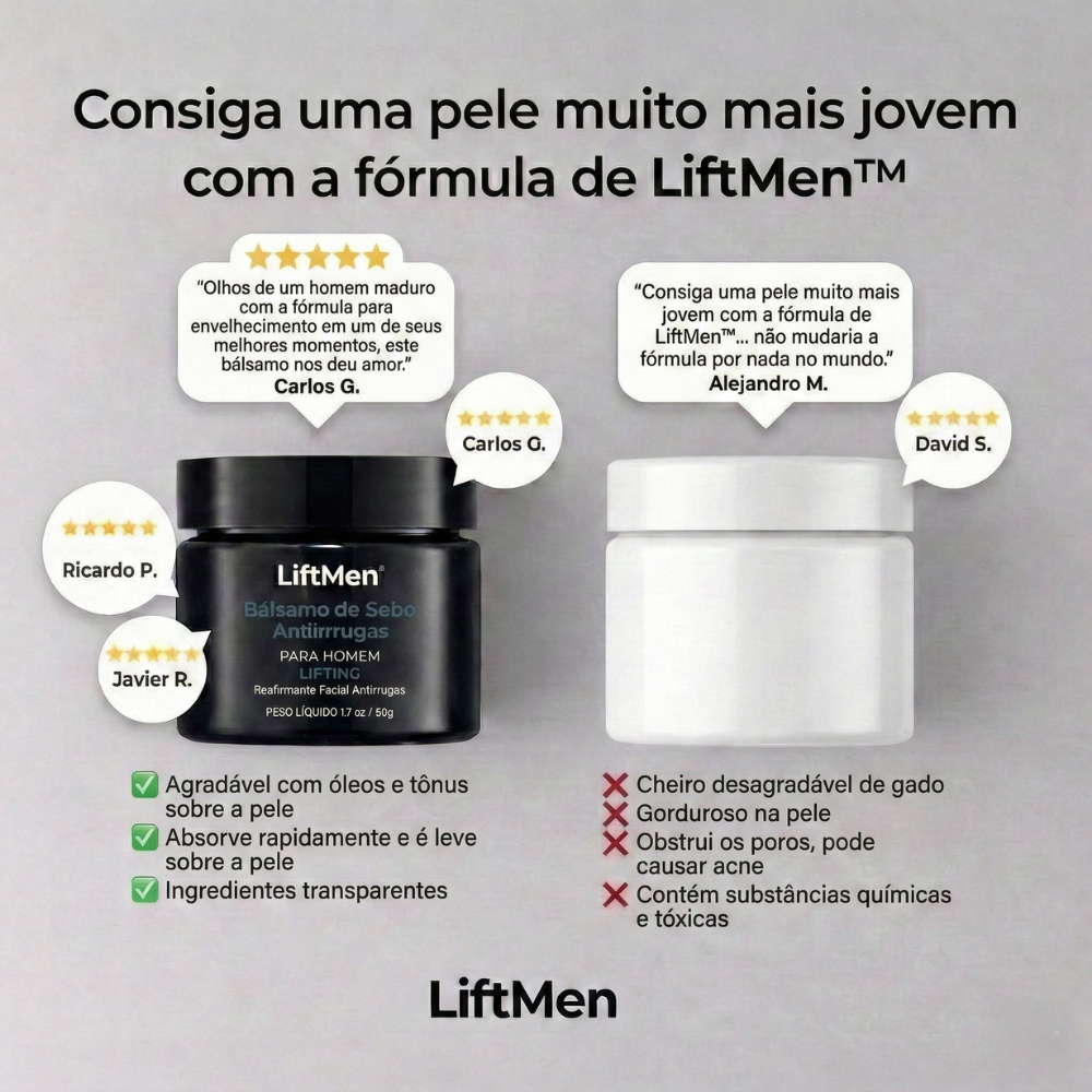 Eu buscava algo sem químicos e LiftMen é exatamente o que eu precisava. Meu rosto parece muito mais jovem.