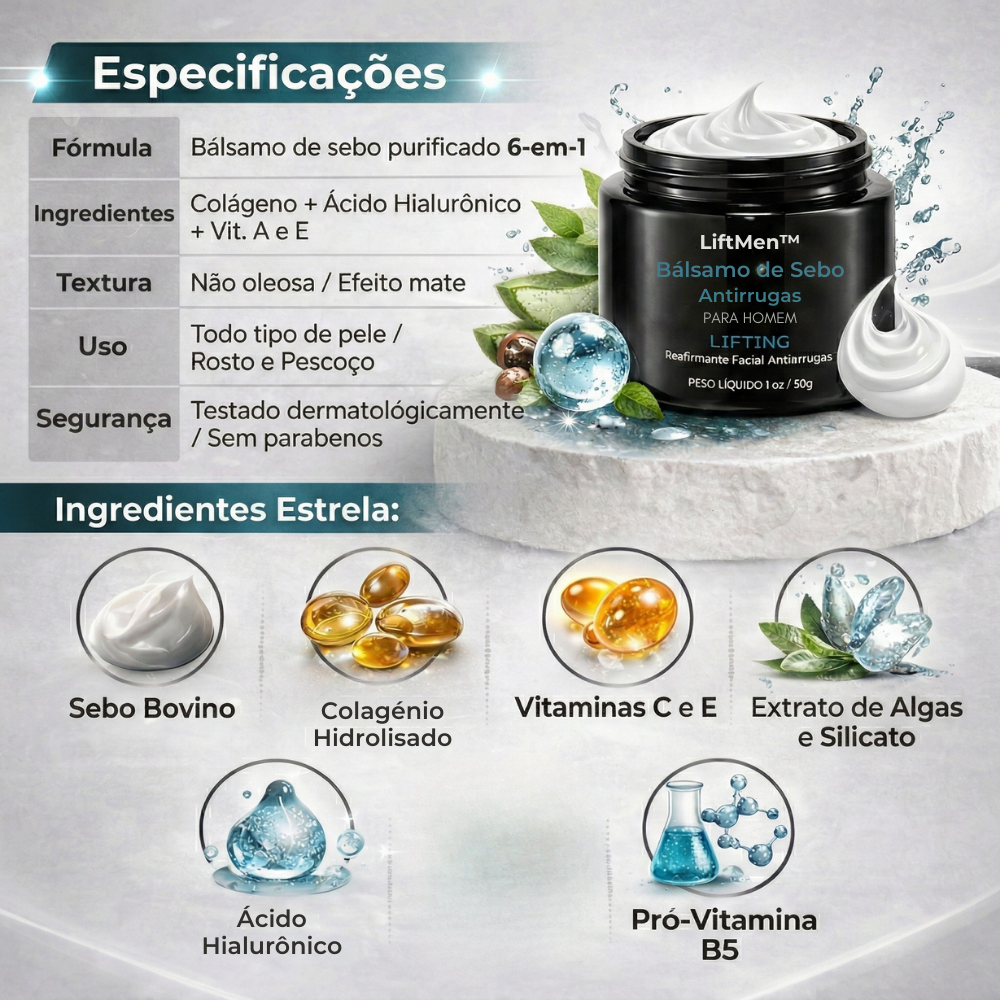 O sebo bovino (tallow) é incrivelmente compatível com a estrutura da nossa pele a nível celular. Ao contrário dos cremes comerciais cheios de químicos, o LiftMen™ fornece vitaminas A, D, E e K de forma natural, proporcionando uma hidratação profunda que as fórmulas sintéticas não conseguem imitar.