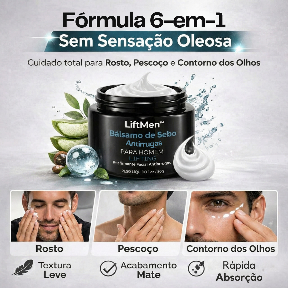 O LiftMen™ é o bálsamo de sebo concebido para o homem moderno. Consegue uma aparência rejuvenescida e forte, eliminando as linhas de expressão com uma fórmula de absorção imediata.